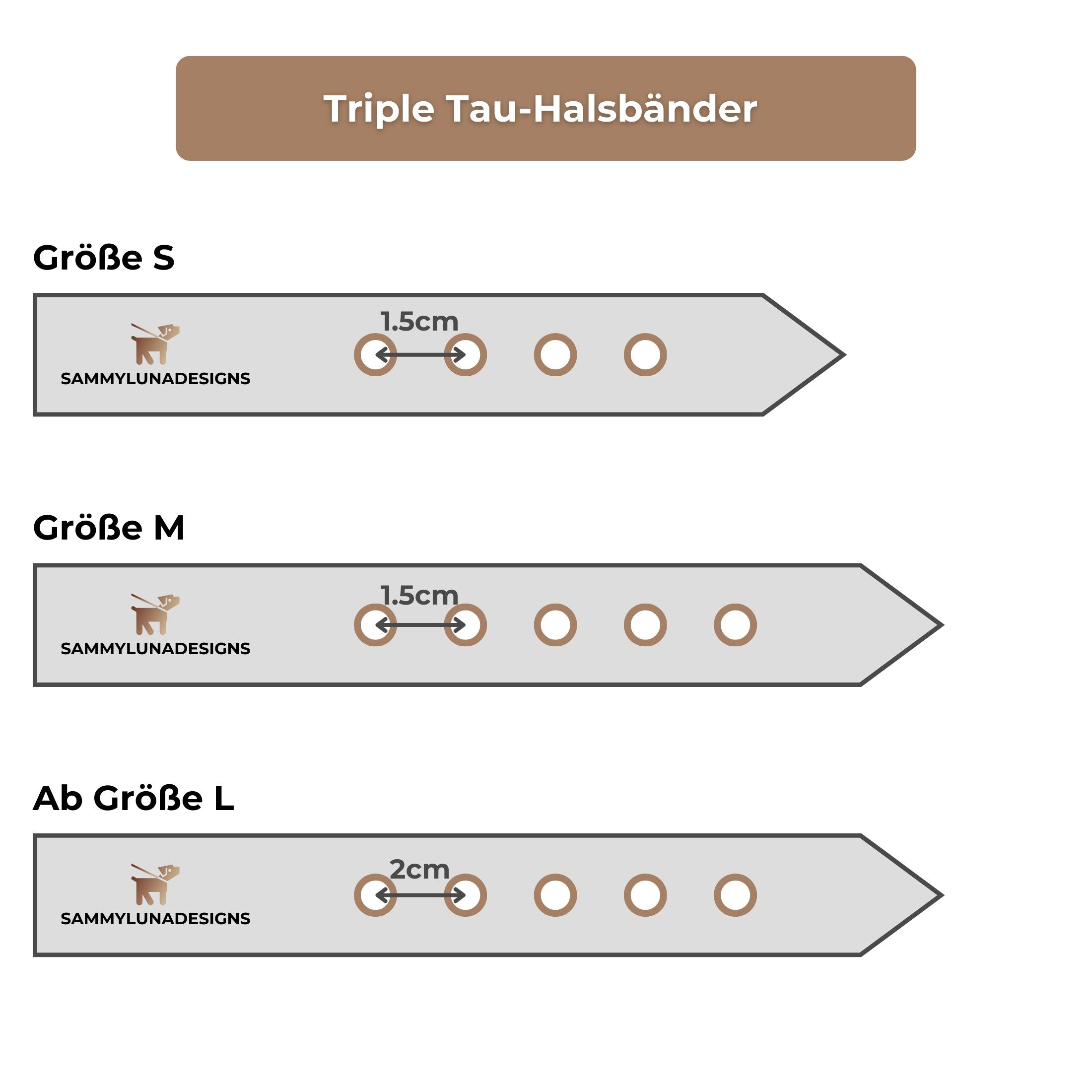 Wir bieten die "Triple-Tauseil"-Halsbänder in den Größen S bis XXL an. Dabei werden die Größen S & M mit einer schmaleren Schnalle ausgestattet, sodass sich das Größenverhältnis besser zur Hundegröße angleichen kann. Das Halsband wird für die Größen S & M mit drei 8mm Seilen und ab L mit drei 10mm Seilen hergestellt.