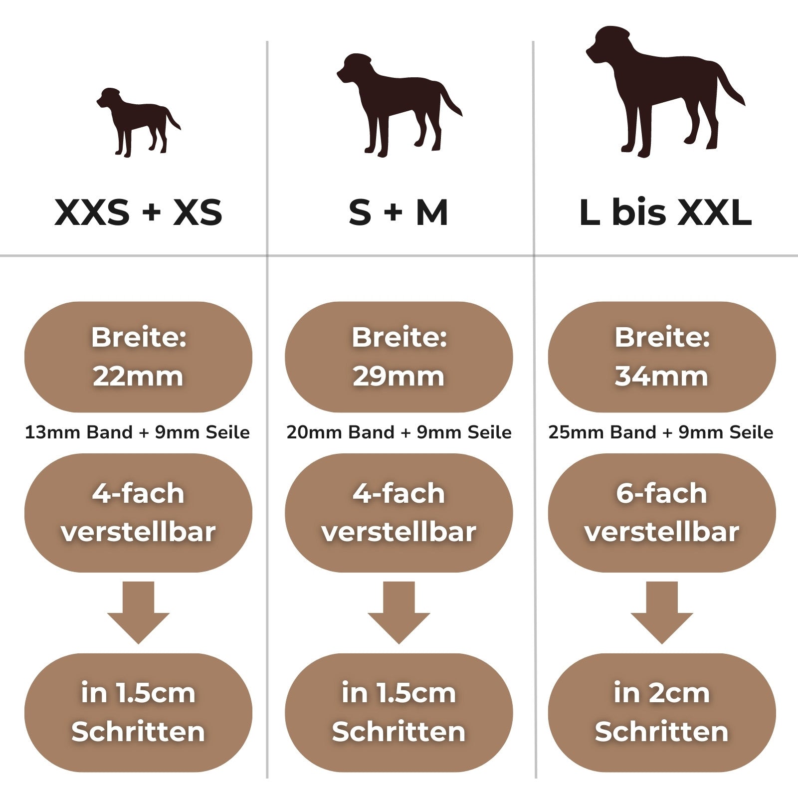 Wusstest du? Ein Großteil der Hunde trägt statistisch gesehen ein zu schmales Halsband. Ein breiteres Halsband verteilt den Druck besser auf den Hals deines Hundes und ermöglicht eine schonende Führung und präzisere Leinensignale.
